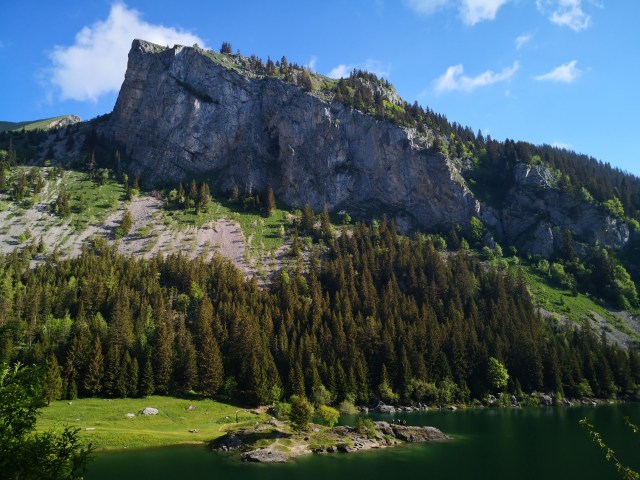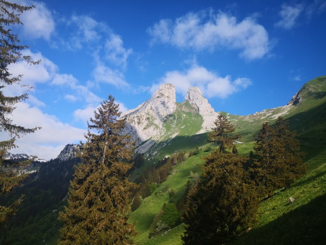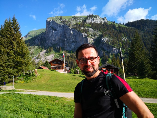 Ajung la Lacul Tanay (1.440 metri) si privelistea deja ma copleseste. Sunt acolo niste cabane frumoase si niste terase deschise. Ma ispiteste gandul sa beau o cafea, dar rezist ispitei si grabesc pasul cand vad ca mai multe grupuri s-au oprit deja sa faca pauza. Ii las pe ei la terase, ii salut si incep a doua parte a ascensiunii. Indicatorul imi spune ca pana in varf mai am doua ore. Cararea lata ce serpuieste prin padure e fenomenala. In vale se aud clopotele vacilor elvetiene care pasc linistite. Brazii isi scot muguri noi si coloreaza frumos padurea. Rup cativa muguri acruti, ii mestec si ma revigorez. Nu am timp sa culeg mai multi, asa ca mai rup cativa si imi continui ascensiunea. Dificultatea traseului e medie as spune eu, ceea ce ma surprinde, pentru ca dupa prima parte care a fost destul de dificila, ma gandeam ca asa va fi tot traseul. La iesirea din padure, perspectiva asupra varfurilor din jur iti taie respiratia. Ma opresc de mai multe ori pentru a admira peisajul si pentru a face niste poze. Langa un fel de adapost de animale, care avea o mica terasa betonata, ma hotarasc sa fac o bine meritata pauza. Ma hidratez, ma energizez, mananc un fruct si mai fac niste poze.