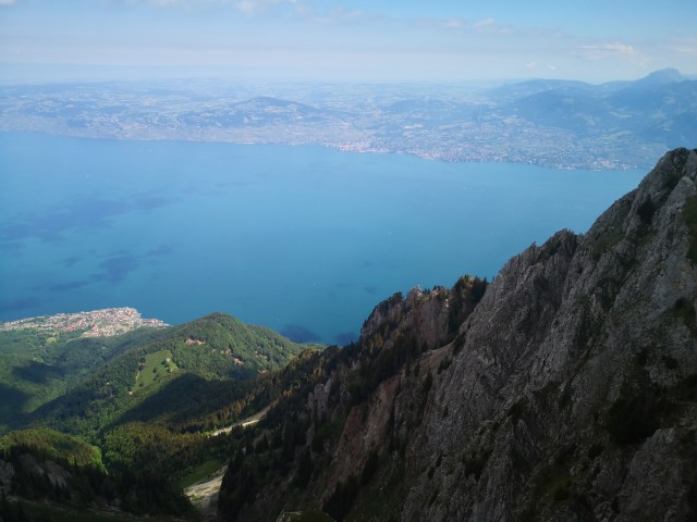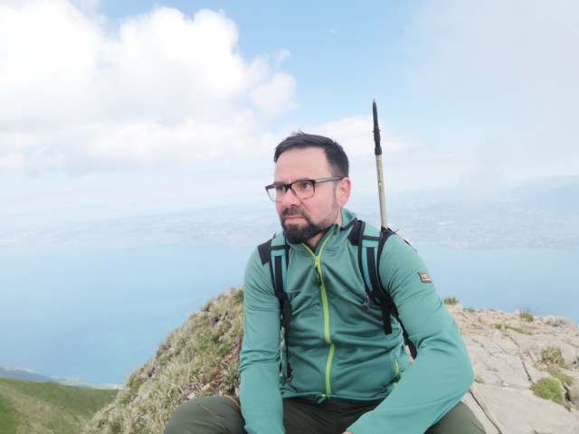 Dupa 15 minute incep ultima parte a ascensiunii. In fata mea niste varfuri stancoase (Les Jumelles, 2.215m) imi aduc aminte de Pietrele Doamnei din Muntii Rarau. Fac opriri destul de dese, dar foarte scurte, pentru a admira peisajul din jur. Ajung in culmea unde cararea se bifurca si raman gura casca. La baza muntelui, dar pe cealalta parte, in toata splendoarea lui se intinde Lacul Leman cu apa lui turcoaz. Vad orasele pe langa care am trecut, iar varfurile din apropiere parca imi fac cu mana. Este destul de inourat, asa ca nu pot vedea foarte mult in departare. Fac din nou poze, in toate directiile si chiar am ocazia sa vad o capra de munte care trece grabita la nici zece metri de mine. Apuc sa o filmez. In departare mai vad doua capre de munte, dar nu mai scot binoclul ca sa le privesc indeaproape. O iau in dreapta si in cateva minute, fix la 10h30, ajung la crucea din varful Le Grammont. Obiectiv atins. Privelisti coplesitoare. Sunt de-a dreptul incantat chiar daca, de data asta, am urcat singur. Partenerii mei de drumetie au cam dezertat. Imi caut un loc linistit, mananc doua sandwichiuri, niste ciocolata si ma bucur de tot ceea ce ma inconjoara. Dar gandul meu zboara si mai sus, la Creatorul tuturor lucrurilor. Ii multumesc pentru ca mi-a dat sansa sa vad o parte din minunata lui creatie. Zabovesc pe varf cam 30 de minute.